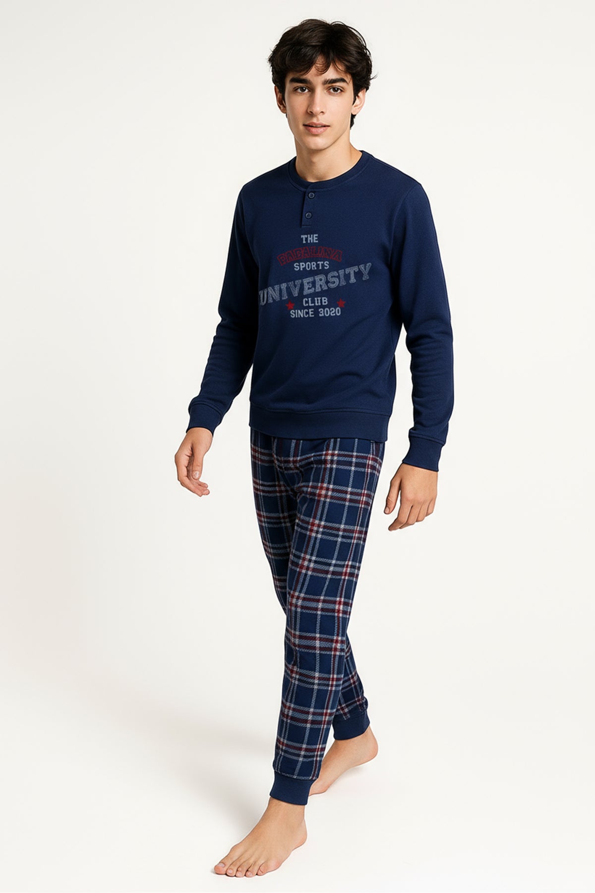 Un pigiama bimbo in caldo interlock, pensato per garantire comfort e libertà di movimento durante la notte. La maglia con stampa a tema university si abbina ai pantaloni a quadri, per un look sportivo e curato. Disponibile nei colori Navy e Avio.