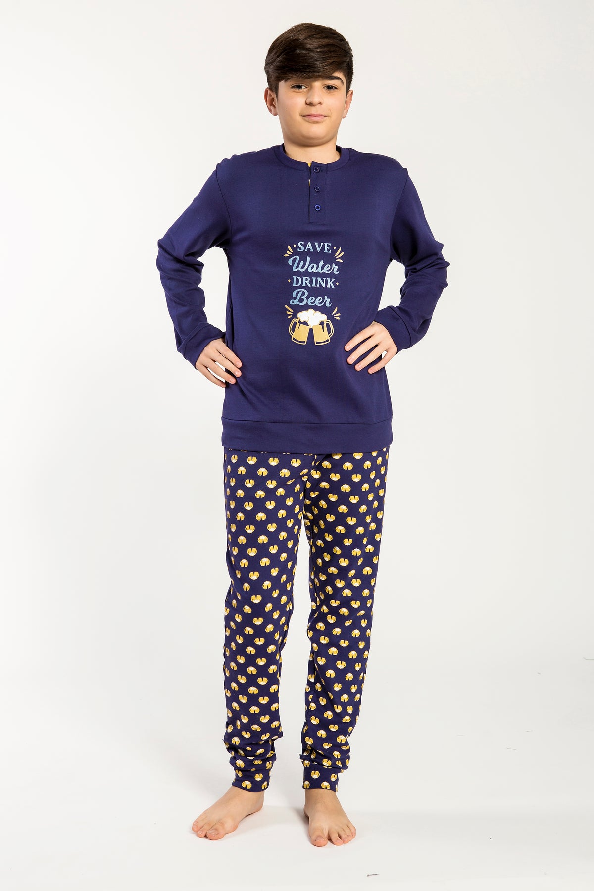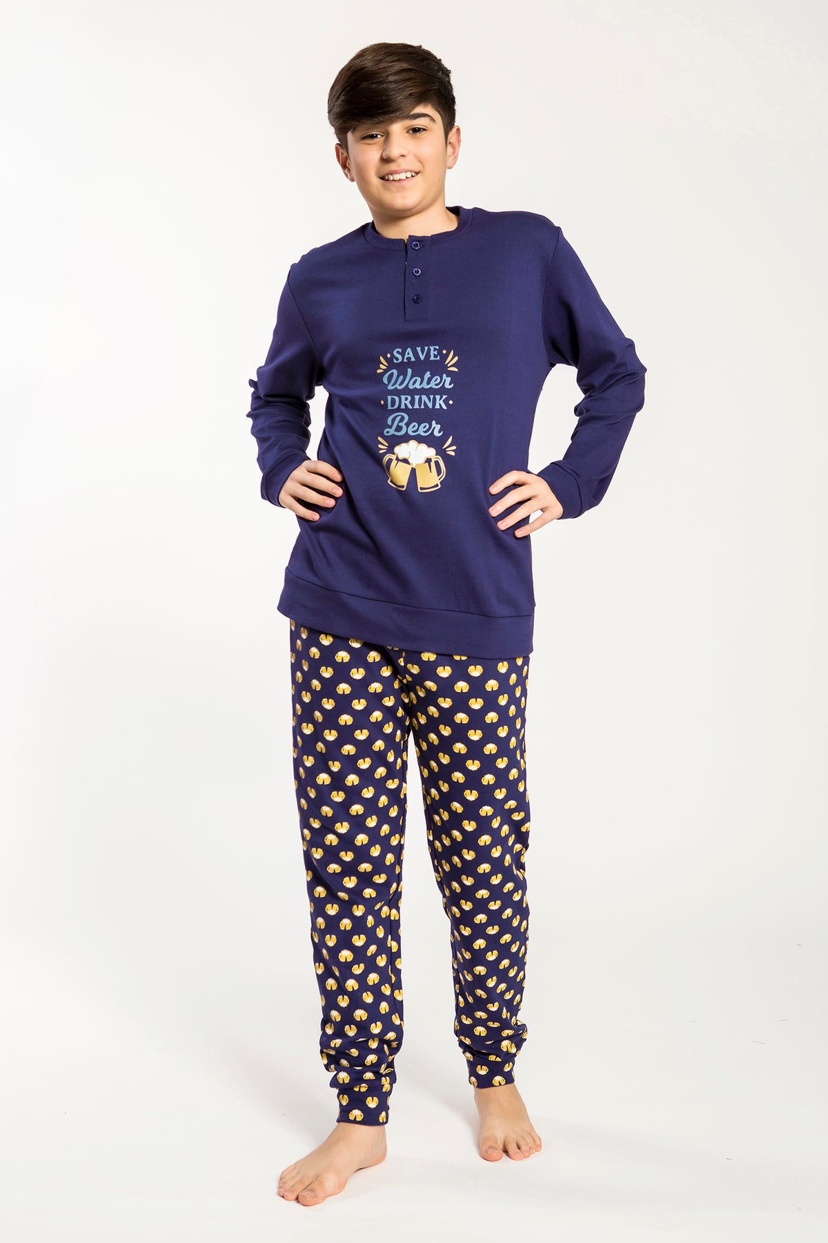 Pigiama in interlock morbido e avvolgente, con maglia girocollo a manica lunga decorata da una simpatica stampa centrale che dona un tocco di originalità. I pantaloni lunghi sono arricchiti da una fantasia coordinata che rende il completo vivace e moderno. Un capo pratico e confortevole, perfetto per accompagnare i ragazzi nei momenti di relax e di riposo quotidiano. Disponibile nei colori Navy e Avio