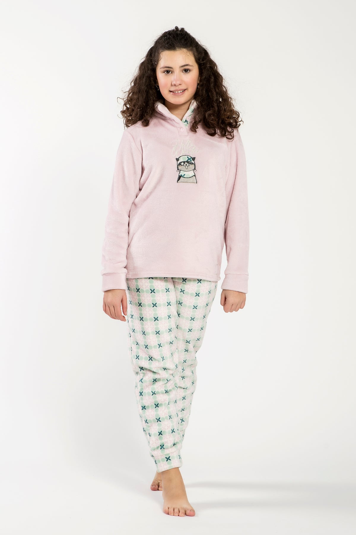 Un pigiama divertente e confortevole, perfetto per la notte e i momenti di relax. La maglia a maniche lunghe presenta una simpatica stampa di cagnolino sul davanti, mentre i pantaloni sono decorati con fantasia geometrica a piccoli motivi incrociati. Disponibile nei colori Rosa e Alba, unisce allegria e praticità per accompagnare le giornate in casa.
