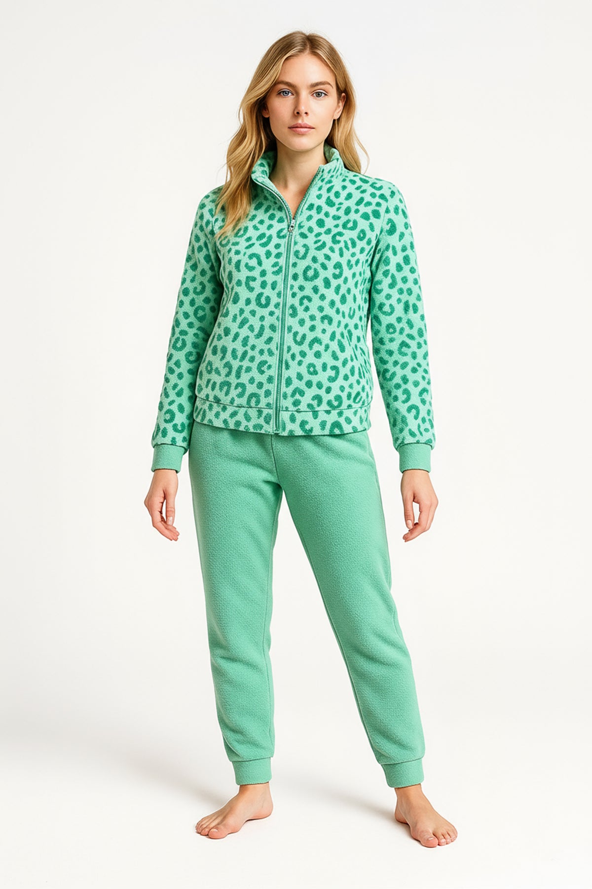 Pigiama in flannel morbido con giacca aperta a zip e pantalone tinta unita. La fantasia vivace del sopra dona un tocco di originalità, mentre il tessuto caldo assicura comfort quotidiano. Disponibile nei colori Acqua e Bordeaux.