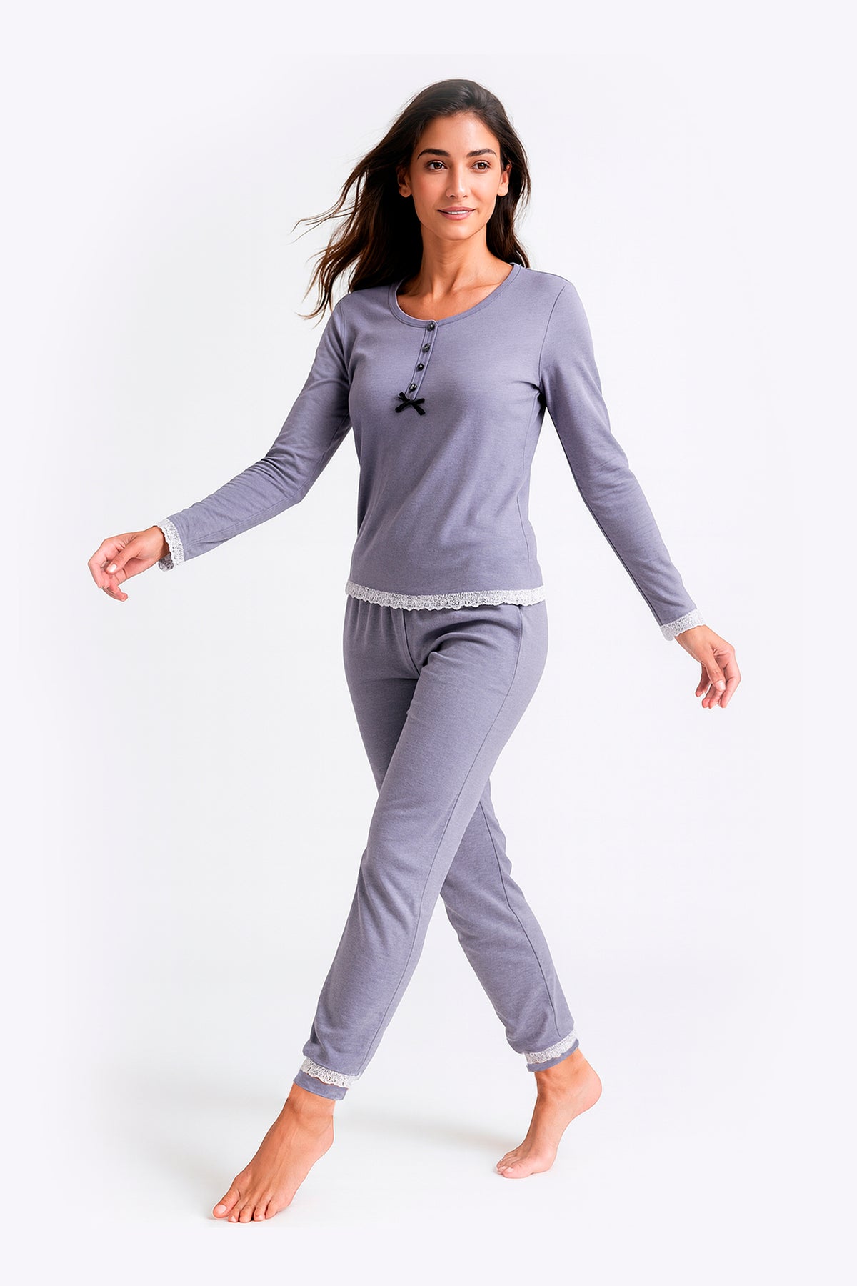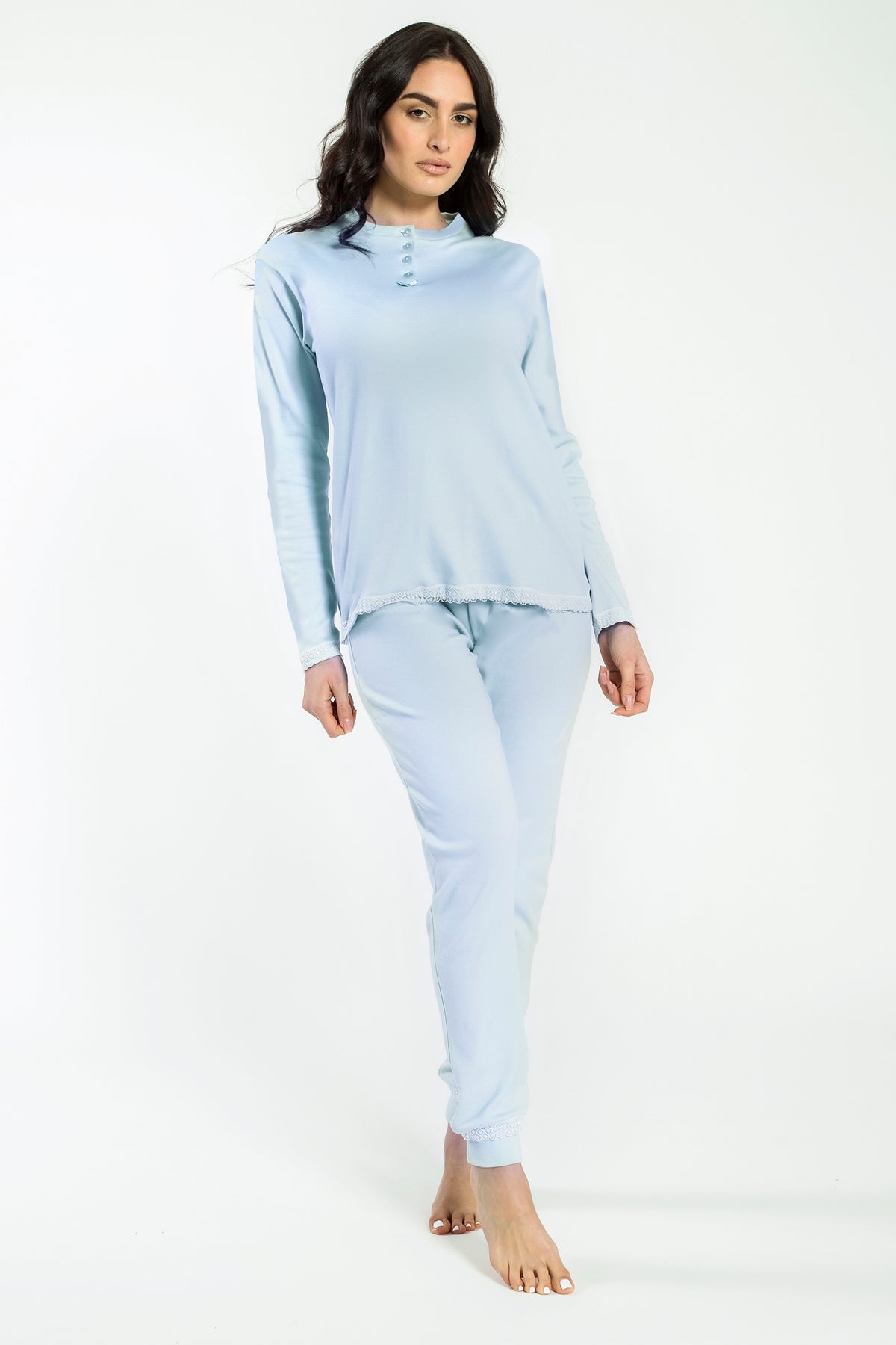 Pigiama in interlock leggero e morbido, caratterizzato da una linea essenziale e confortevole. Il modello è impreziosito da piccoli dettagli sullo scollo, che donano un tocco delicato e femminile. Disponibile nei colori Cielo e Lavanda, ideale per accompagnare le serate con praticità e stile.