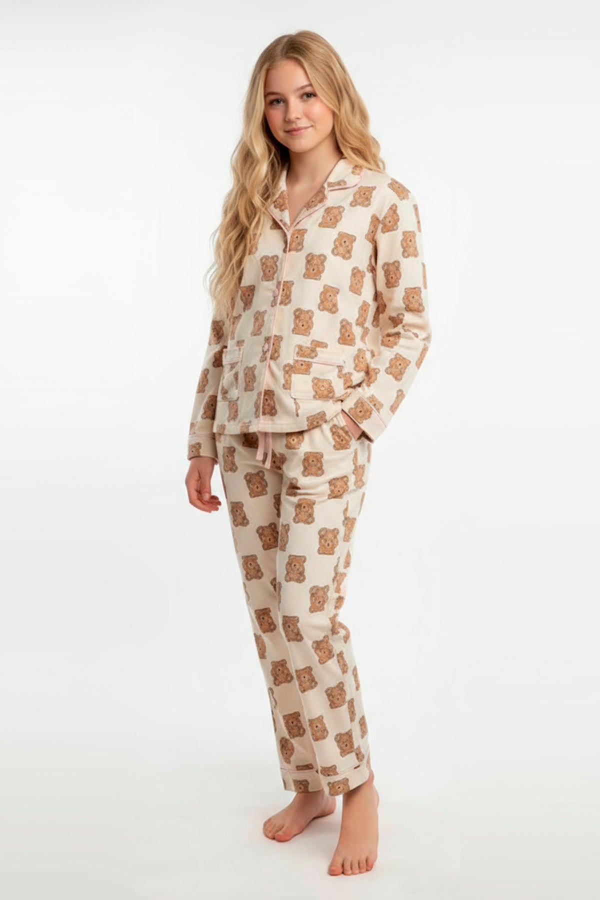 Pigiama in morbido interlock con modello a giacca aperta e bottoni frontali. Caratterizzato da una fantasia con simpatici orsetti, unisce praticità e calore per il relax quotidiano. Disponibile nei colori Bordeaux e Rosa, in taglia unica per una vestibilità comoda e versatile