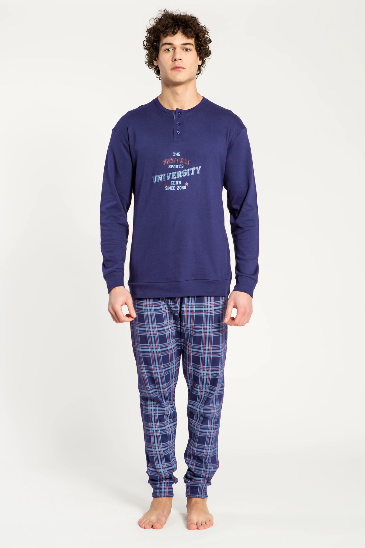 Pigiama in interlock morbido e confortevole, con maglia girocollo arricchita da un dettaglio stampato sul petto che dona carattere sportivo e deciso. I pantaloni lunghi a quadri completano il look con un tocco classico e intramontabile. Un modello pratico e moderno, ideale per accompagnare i momenti di relax con stile. Disponibile nei colori Navy e Verdone.