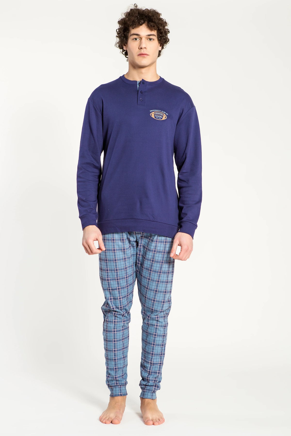 Un pigiama che unisce stile e comfort quotidiano. La maglia in interlock, morbida e resistente, è arricchita da un piccolo dettaglio ricamato sul petto che dona carattere senza rinunciare alla semplicità. Il pantalone lungo con fantasia scozzese aggiunge un tocco deciso e maschile, ideale per chi ama distinguersi anche nei momenti di relax.Disponibile nei colori Navy e Verdone.