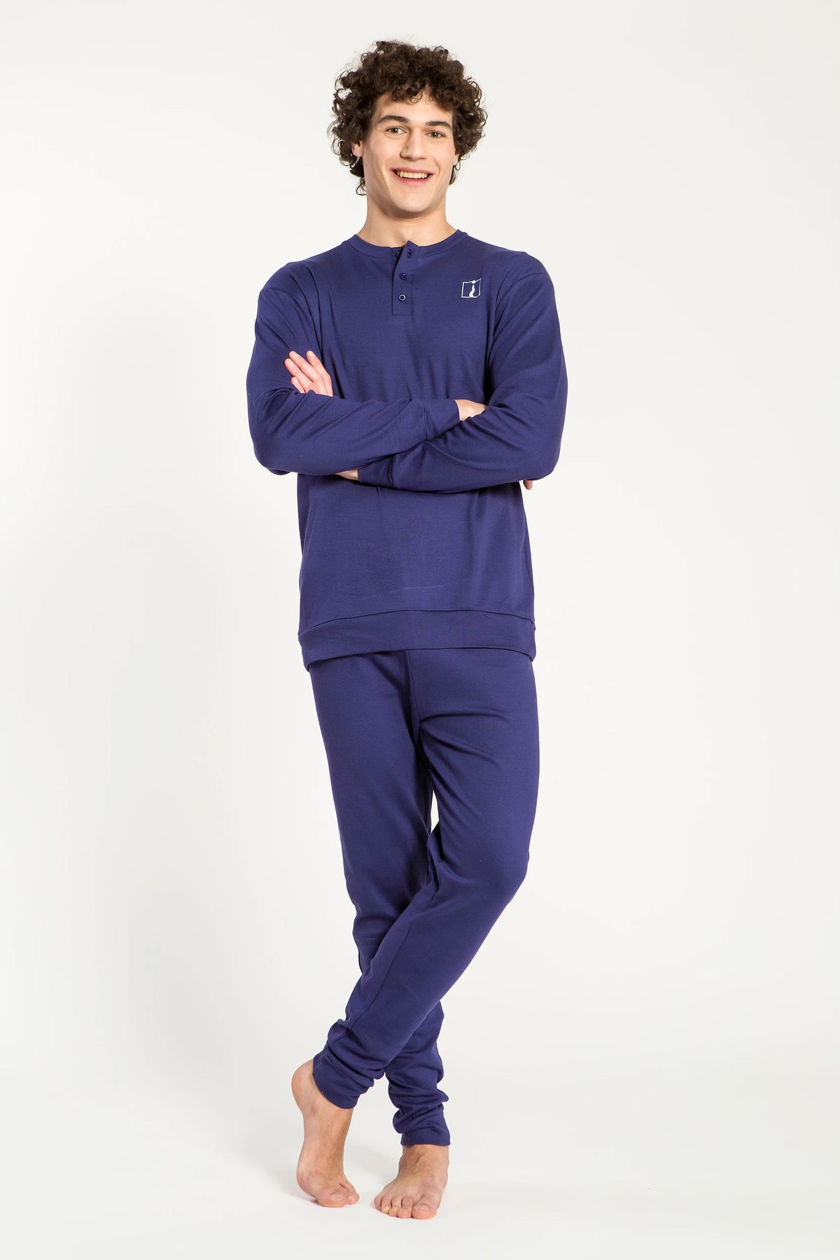 Pigiama in interlock morbido e pratico. La maglia girocollo con bottoncini e logo ricamato è abbinata a pantaloni tinta unita, per un look essenziale e confortevole. Disponibile nei colori Navy e Avio.
