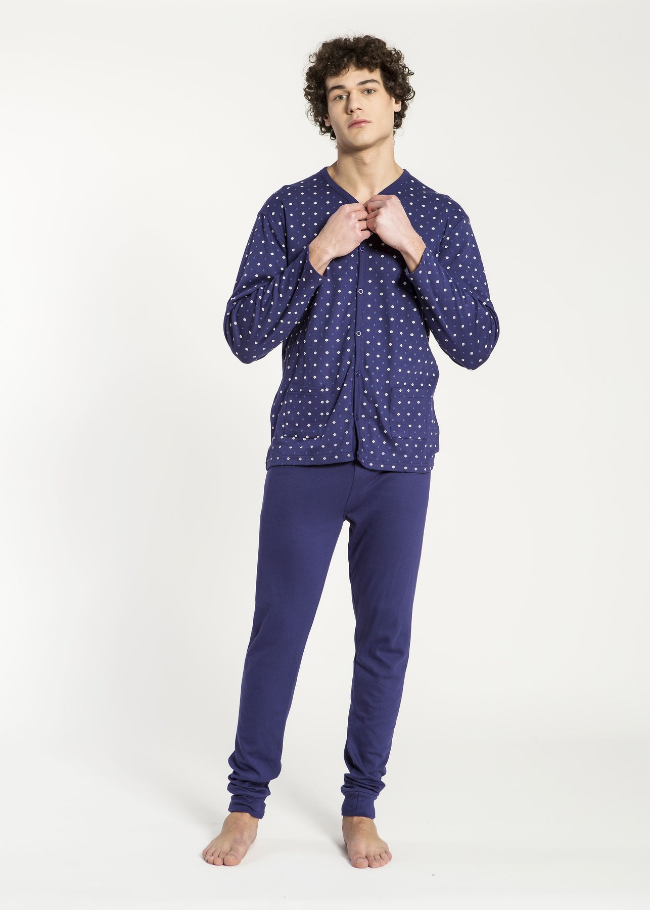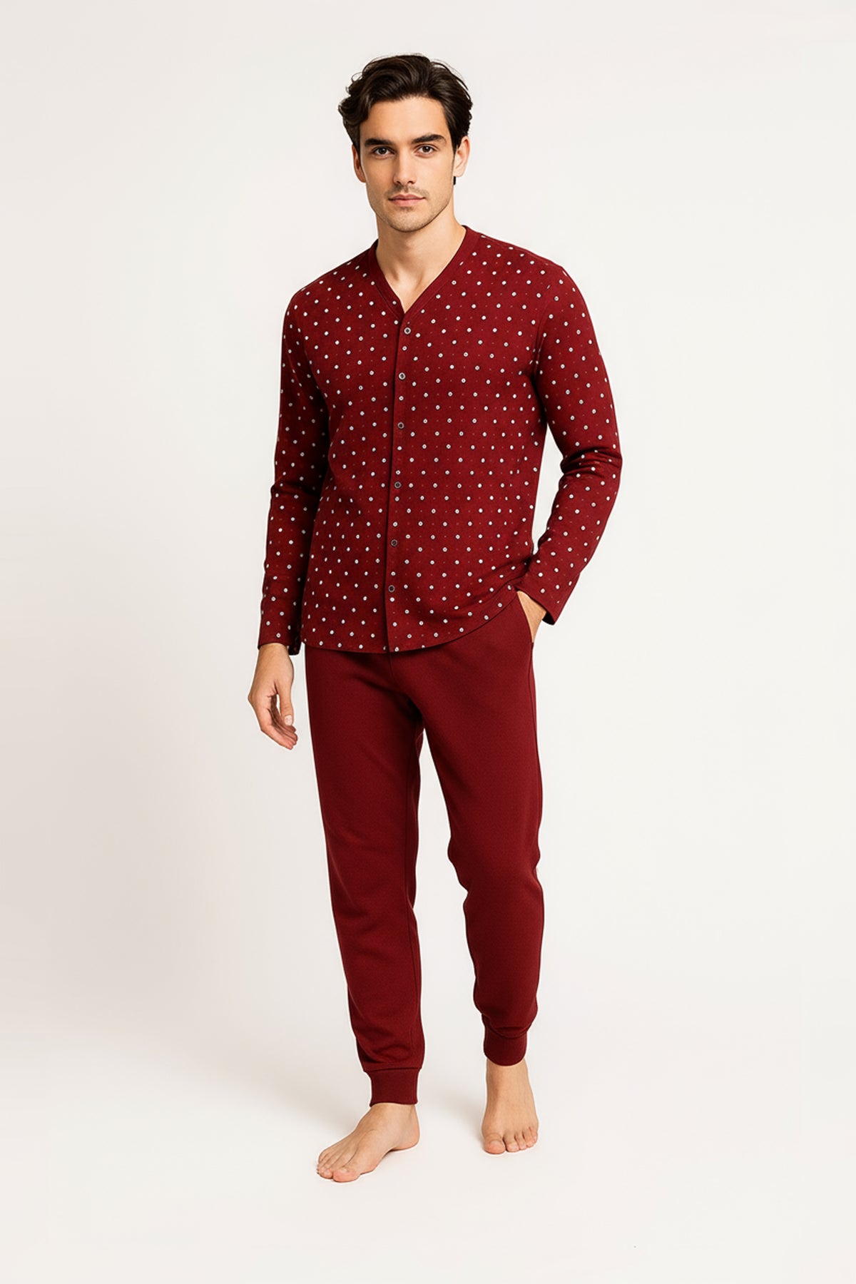 Pigiama in interlock caldo e confortevole. La casacca a bottoni con microfantasia si abbina ai pantaloni tinta unita, garantendo comodità e stile quotidiano. Disponibile nei colori Navy e Bordeaux.