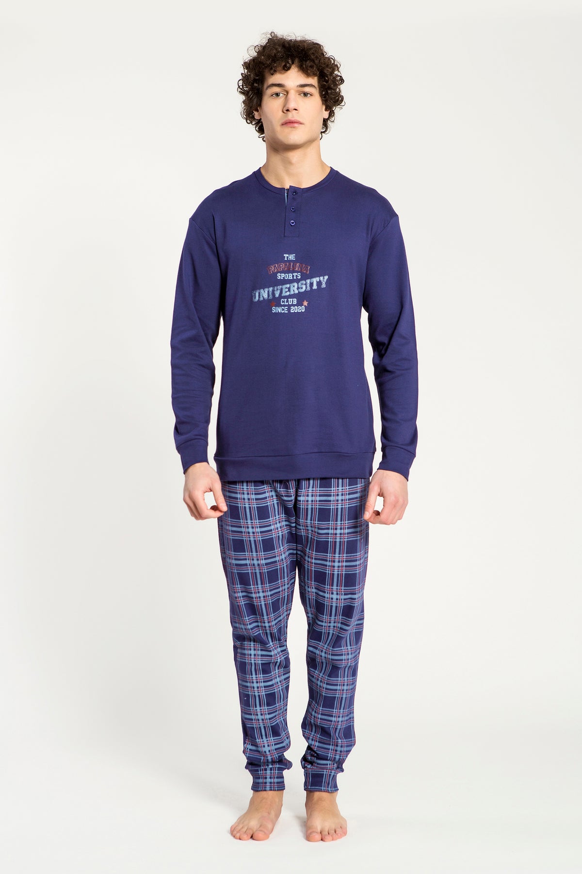 Pigiama in interlock morbido e confortevole, con maglia girocollo impreziosita da una stampa college ispirata allo stile universitario. I pantaloni lunghi a quadri aggiungono un tocco classico e deciso, rendendo il completo ideale per le serate di relax. Un modello pratico, resistente e curato nei dettagli. Disponibile nei colori Navy e Avio.