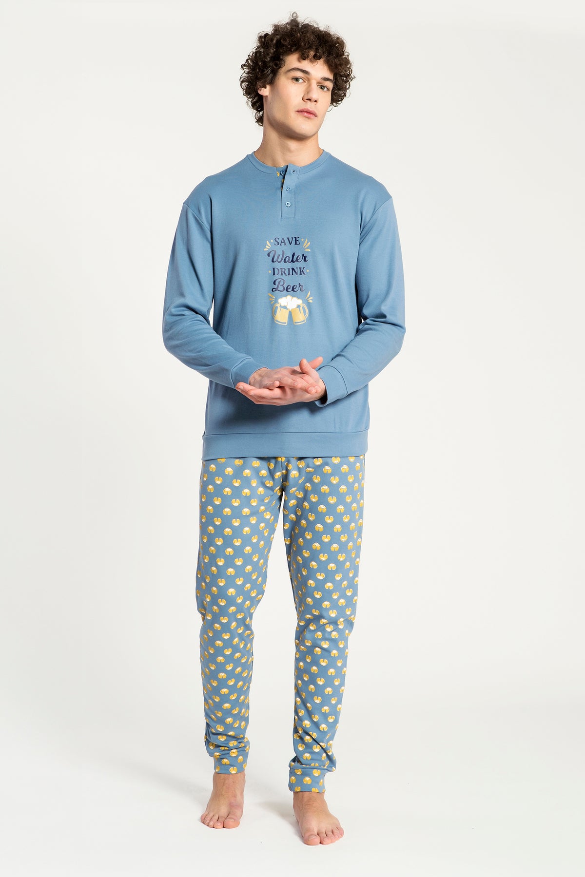 Pigiama in interlock leggero e avvolgente, con maglia a serafino impreziosita da una stampa centrale divertente che dona un tocco di originalità. I pantaloni lunghi a fantasia coordinata creano un look fresco e moderno, perfetto per distinguersi anche nei momenti di relax. Un modello pratico e confortevole, ideale per l’uso quotidiano. Disponibile nei colori Navy e Avio.