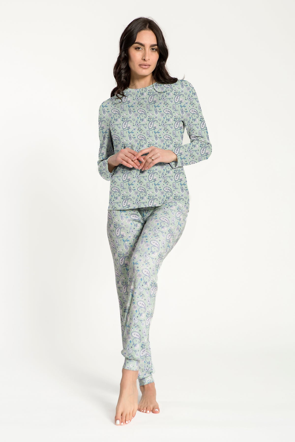 Pigiama in tessuto milk silk morbido e leggero, con maglia tinta unita a serafino e pantaloni fantasia paisley. La combinazione di linee semplici e stampa raffinata regala un look elegante e confortevole. Disponibile nei colori Indaco e Salvia, per uno stile pratico e curato.